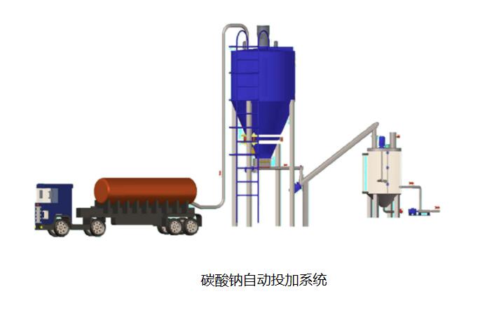 碳酸鈉制備投加系統(tǒng)設置于煤氣凈化ADA脫硫單元內(nèi)部,碳酸鈉粉末散裝通過罐車采用車載氣力輸送將粉料輸送到儲料倉,經(jīng)過過濾除塵將空氣排除,粉末截留至料倉中完成卸料。